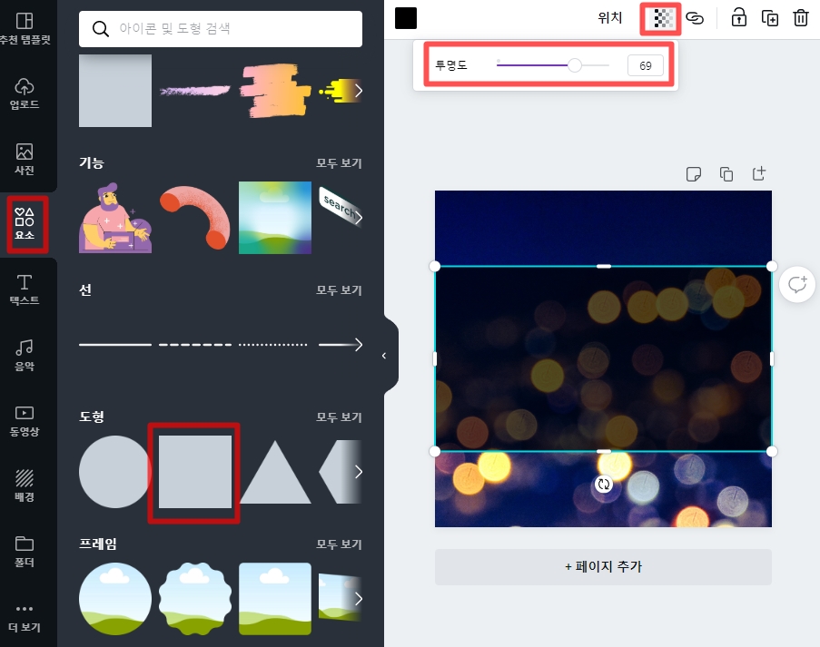 요소에서 박스 도형 선택 -> 정중앙에 크기 맞추기 -> 박스 색 선택 -> 투명도 설정