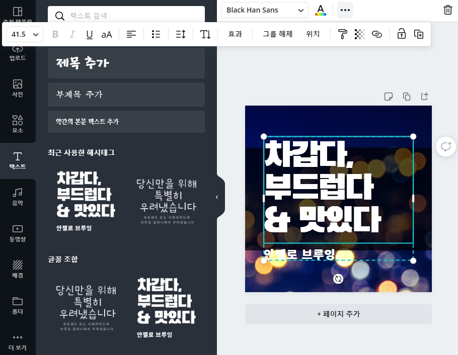 Black Han Sans 폰트를 이용한 글자를 사용했습니다. 네모 박스 안에 맞게 사이즈를 맞춰 줍니다.