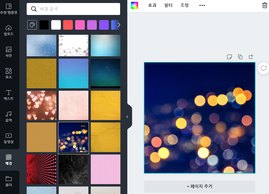 왼쪽 메뉴 중에서 요소, 텍스트, 배경 세가지만 사용할 것입니다.