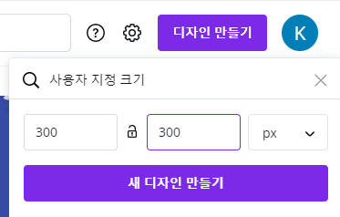 사이트 오른쪽 상단에서 디자인 만들기 클릭 후 사용자 지정 크기를 설정합니다. 클 필요가 없으므로 저는 300X300 px로 설정했습니다.