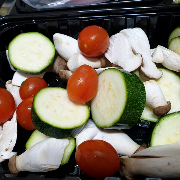 시즈닝 가루를 넣고 빠르게 볶습니다. 화력은 강해야 합니다. 채소를 삶듯이 먹는 것이 아니기 때문에 이때는 강한 불에서 버섯이 육안으로 익은 모습이 되면 불을 끕니다. 방울토마토를 반으로 자르라고 되어있는데요 차라리 통으로 하는 것이 더 나았던듯합니다. 이건 각자의 취향 차이.