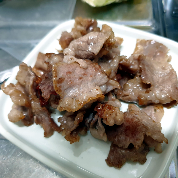 우삼겹을 노릇하게 익힌 후 접시에 놓아둡니다. 팬은 세척하지 않고 우삼겹 기름 그대로 사용합니다.