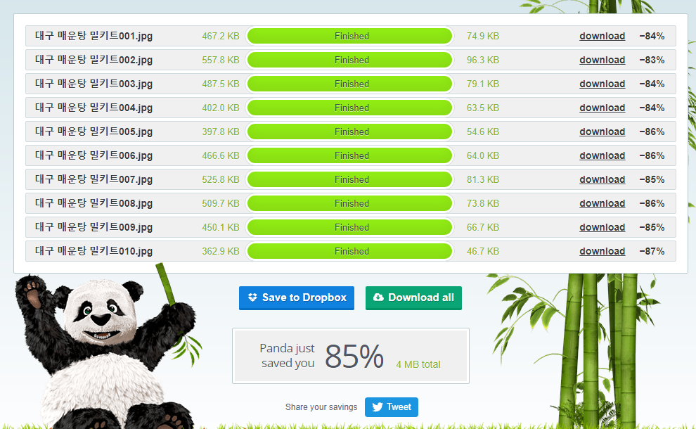 결과는 대단합니다. 무려 85%나 압축되었습니다. 4.14M에서 10개의 사진이 684KB가 되었습니다. Download all를 하면 zip 파일로 저장됩니다. Save to Dropbox는 가입 후 이용하면 됩니다만 다운로드하는 것이 더 편리했습니다.