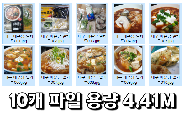 얼마 전에 올린 대구매운탕 밀키트에 사용된 사진입니다. 10개 파일이며 4.41M 용량입니다. 용량이 큰 편은 아닙니다만 페이지 속도를 빠르게 하기 위해 더 압축을 진행해봅니다.