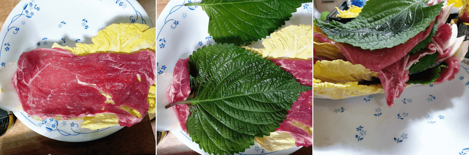배추잎배춧잎 위에 소고기를 펼쳐서 올립니다.