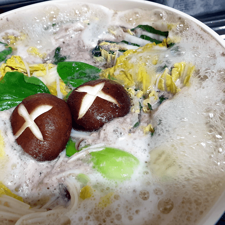 고기만 익으면 먹을 수 있으므로 끓이는 시간은 길지 않습니다. 표고버섯이 침몰 되었으나 사진 찍으려고 꺼내서 위에 올려놔봤습니다. (음식 조리과정 사진 잘 찍으시는 분들 존경합니다.) 국물 위로 둥둥 뜨는 불순물들을 제거해주면 국물이 더 깨끗합니다.