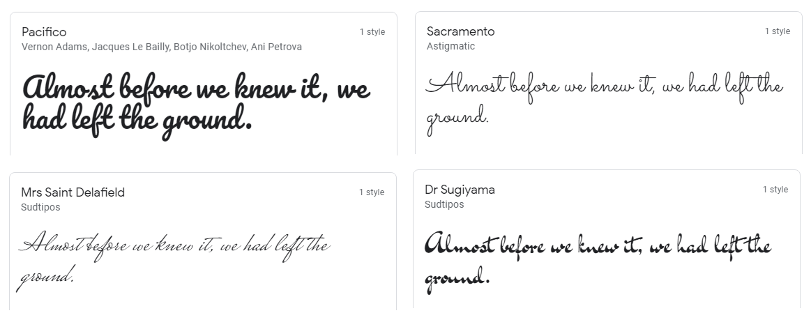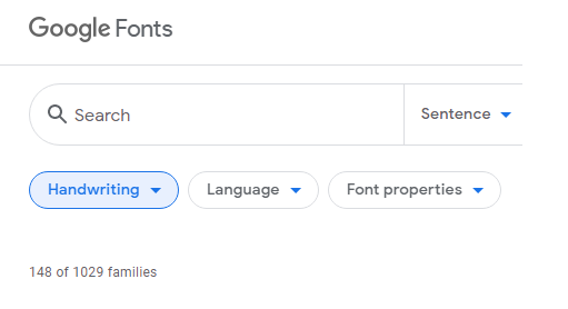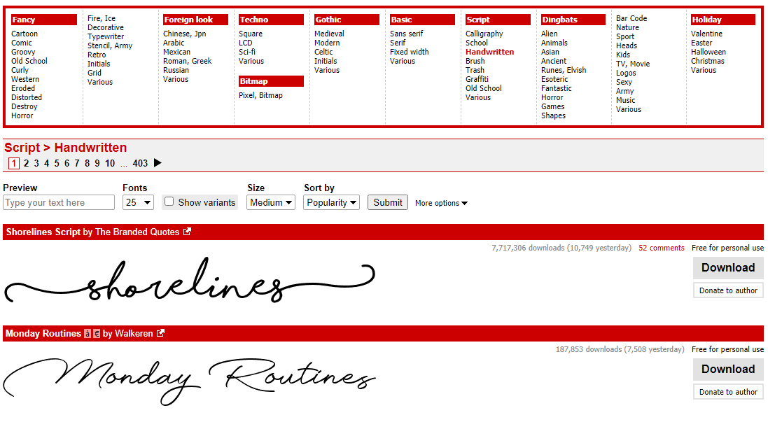 dafont 사이트에 접속 후 Handwritten를 체크하시면 영어 필기체 폰트를 확인할 수 있습니다.