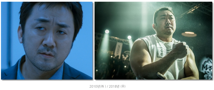 8년 마동석 배우 40살. 턱 선이 아주 계란형. 영화 보다가 마동석 배우 나오면 아이구! 근육이 많지 않던 시절이네!.. 다른 배우들은 세월의 흐름이 안 느껴지는데 마 배우만 유독 눈에 보이던...